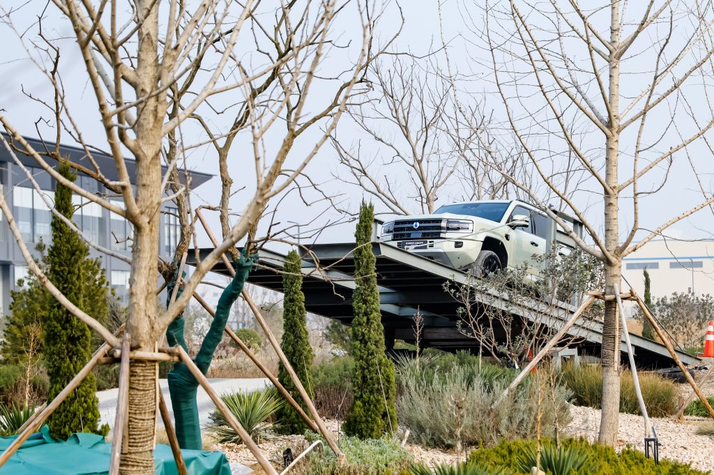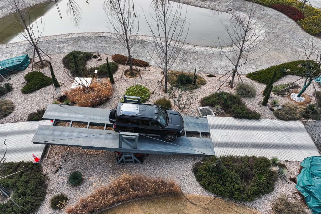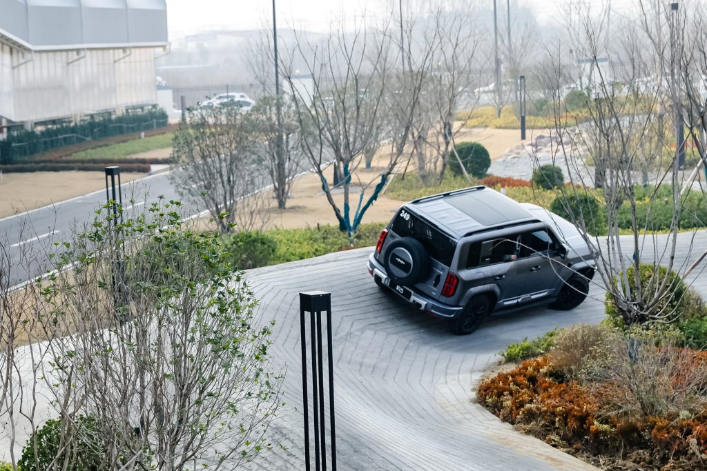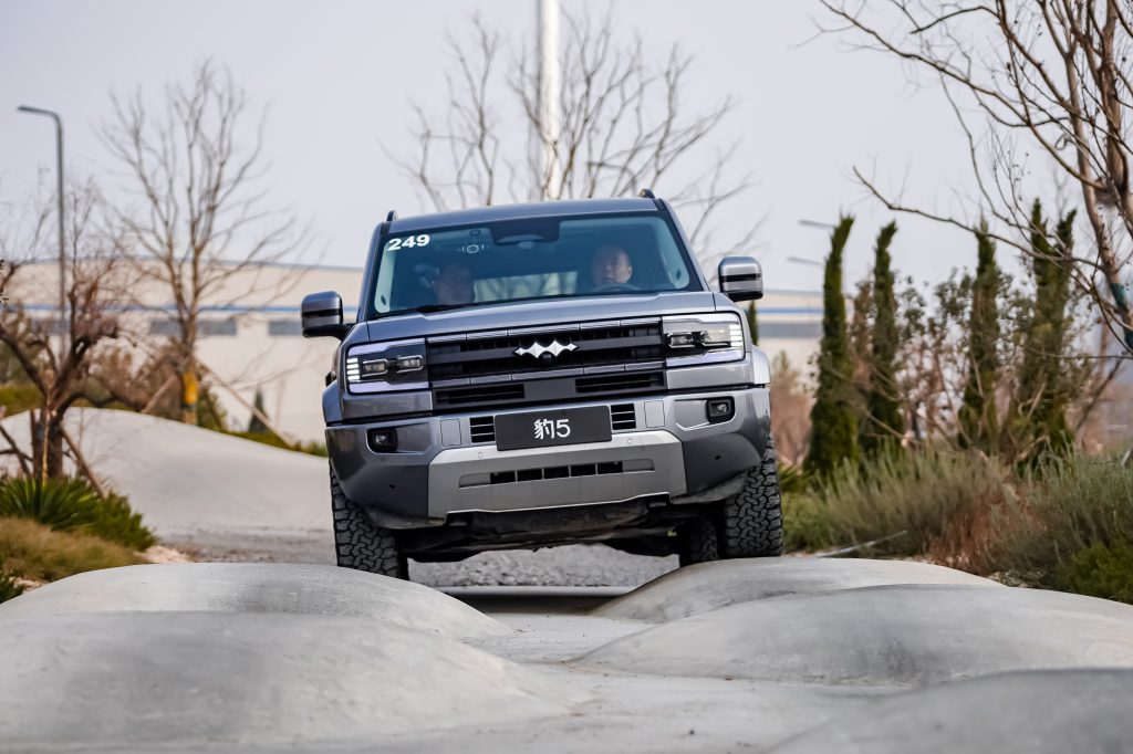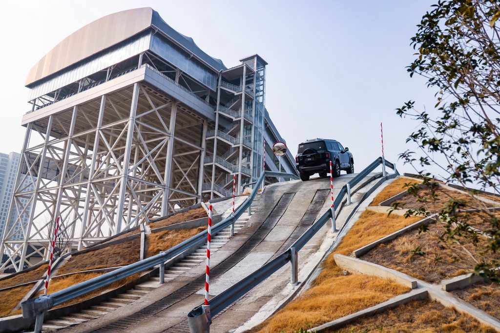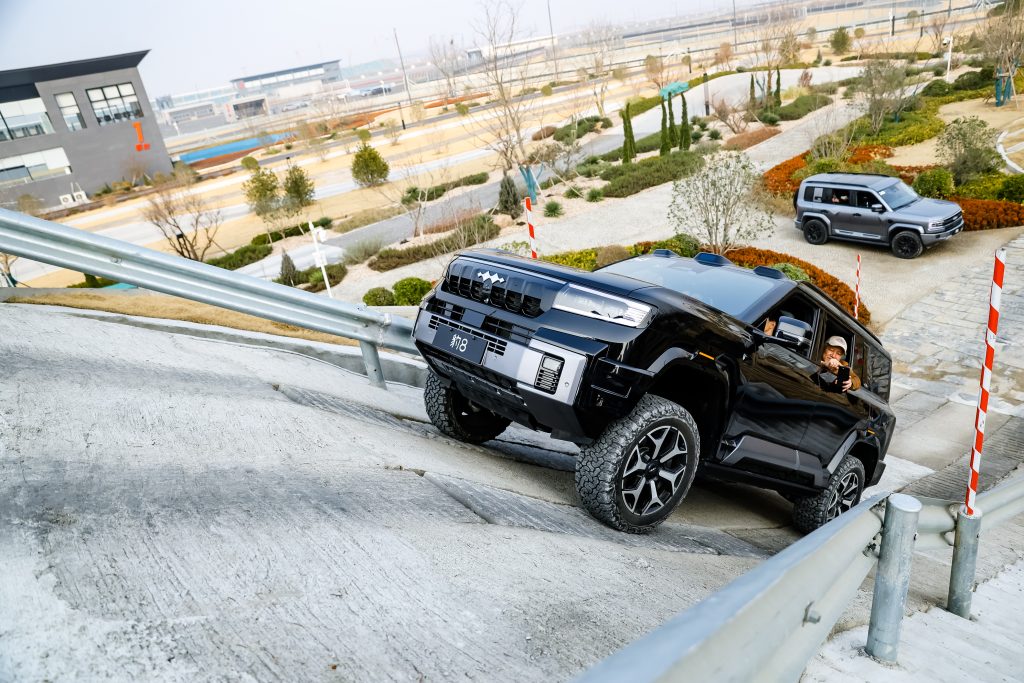 場內的越野區是目前全中國規模最大,由27個越野項目組成,有左右凹凸路面、搖搖板、U形窪道,以及兩個坡度不一的斜坡,其中一個更達42度。頭一輪由教練示範,試坐的Denza B5配1.5公升turbo插電混能引擎,馬力及扭力輸出高達687匹及760Nm,不論在on road或off road都能應付自如。由於本身扭力大,在區內全程以摩打行駛,即使面對坡度達42度的超級大斜坡都如履平地,只需打開暴力模式,系統會鎖起其中一個差速,然後會啟動引擎一齊發力,B5就能輕鬆攀上42度大斜坡。