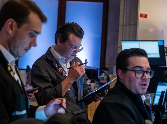 2025年2月20日、ニューヨーク証券取引所でトレーダーたちが作業を行っています。
