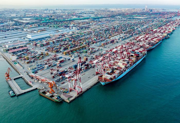 中国の青島港の千湾コンテナターミナルの全景(2023年3月17日)において、初めに示したデータによりますと、中国の輸出成長率は年初から予想を下回り、米国の関税の影響が一因となっています。2023年1月から2月の間の輸出は、前年同期比で米ドルベースで2.3%増加しましたが、これはロイターの調査による5%の増加予想を大きく下回る結果です。
