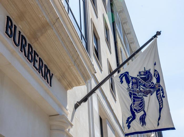ロンドンにあるバーバリー・グループ(Burberry Group Plc)高級ブティックの外にはエクエストリアン・ナイト・デバイスのロゴが描かれた旗が掲げられています。バーバリーは水曜日に、嵐の中での再建努力の一環として一連の組織変更を発表しました。