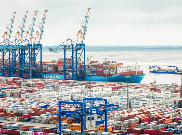 2025年7月18日、ブレーメン、ブレーマーハーフェン:海外港でのコンテナの取り扱い