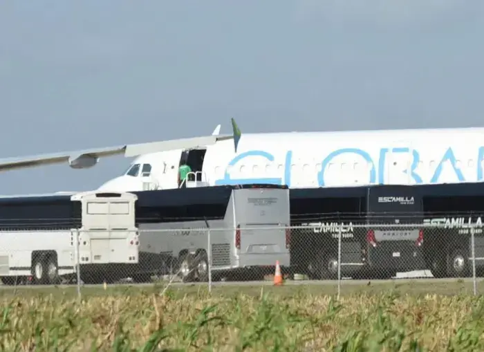 米国テキサス州ハーリンゲンで、2025年8月31日(日曜日)に、航空機に搭乗する複数の移民の姿が見られました。この状況は、トランプ政権による移民の強制送還に対する緊急の法的措置が講じられたことを受けてのものでした。