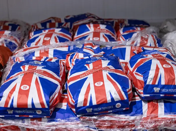 イギリスのノリッチにあるD & F McCarthy Ltd.の新鮮な果物と野菜の卸売業者で栽培されたジャガイモの袋が、2023年2月28日火曜日に映し出されました。イギリスのスーパーマーケットの棚でサラダアイテムが急激に不足しており、これが政治的な議論を引き起こしています。業界内では、この状況をブレグジット(Brexit)に帰する声もあれば、他の問題の隠れ蓑と見る意見もあります。