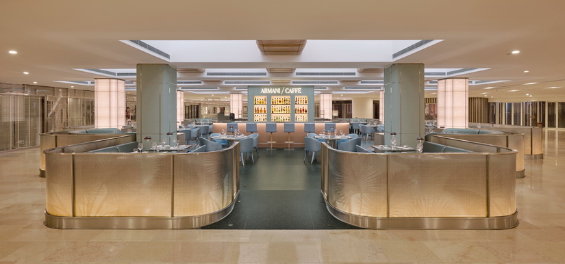 Armani 集團宣佈於金鐘太古廣場正式開設香港首間 ARMANI/CAFFÈ,毗鄰最新開業的 Giorgio Armani 精品店,為購物旅程帶來全新休憩選擇。店舖佔地約250平方米,可容納約一百名賓客,設計概念由 Giorgio Armani 與其建築團隊親自構思,延續品牌一貫現代優雅風格,中央設有矩形吧台,配以舒適的私密座位,營造出輕鬆雅致的氛圍。空間以金色、柔和藍色及綠色為主調,融入 Armani 經典圖案,中央吧台採用缎光金色豎紋木質飾面,搭配深綠色水磨石地磚及香檳色金屬鑲邊,立柱則覆以 Armani/Casa 縞瑪瑙紋理牆紙,搭配背光燈設計增加空間層次感,低矮牆身以簡約弧形金屬結構框出休憩區域,牆面棕櫚樹圖案為整體增添通透感,將現代設計與意式精緻氛圍平衡展現。