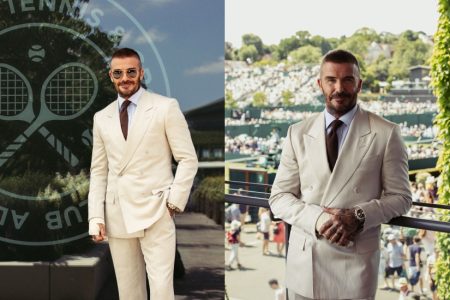 David Beckham以BECKHAM x BOSS米白雙排釦西裝亮相溫布頓