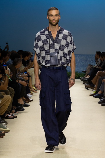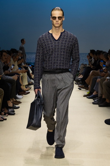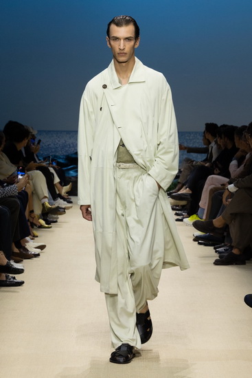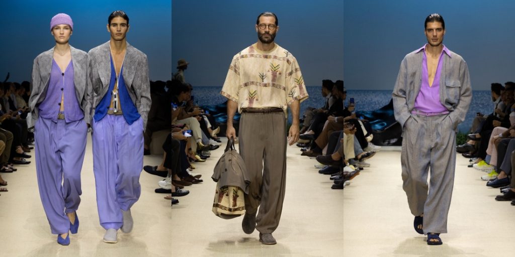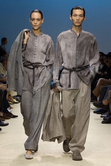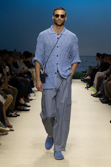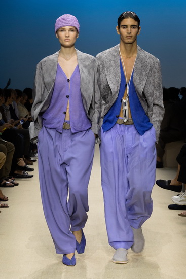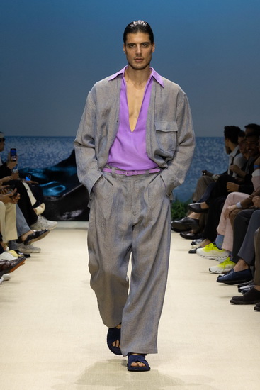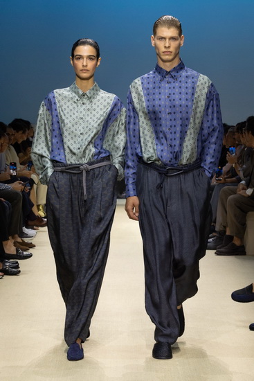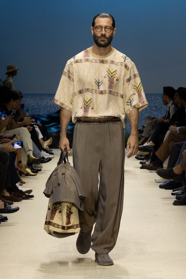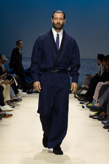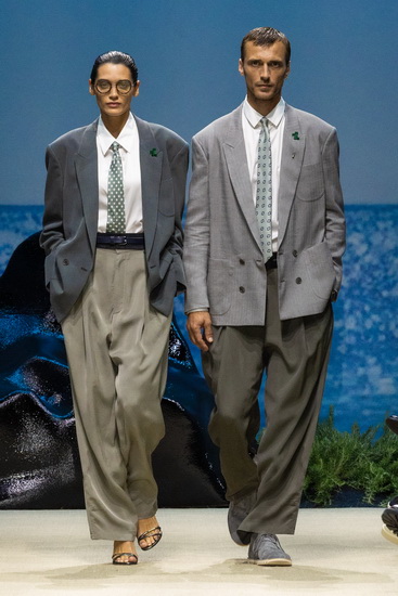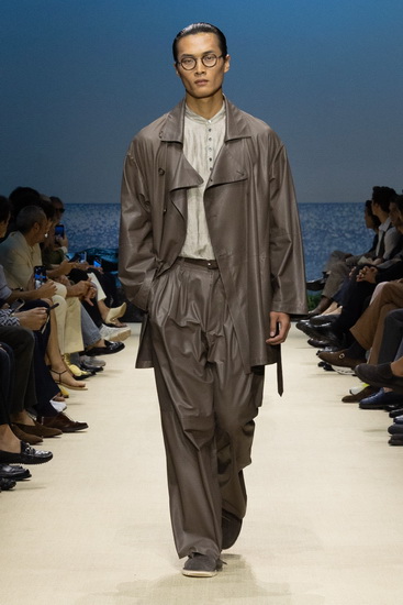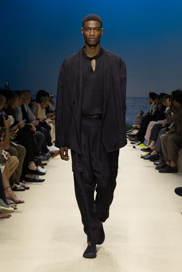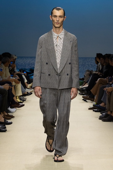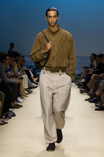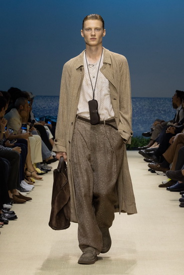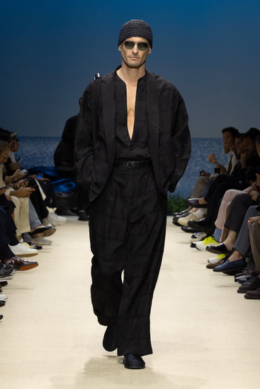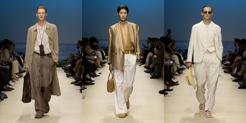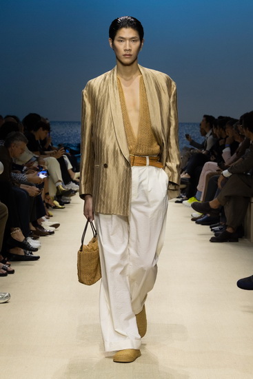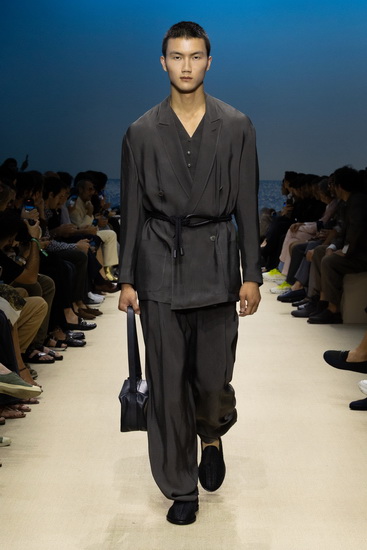 Giorgio Armani 2026春夏男裝系列,將東西方、南北方的設計元素無縫融合,創造出一個獨特的都市與假日風格交融的氛圍。這一系列在面料與結構的選擇上充滿了輕盈感,並在流暢剪裁中展現出極致的舒適感。雙排扣青果領西裝重新詮釋經典,以低開襟的設計與精緻的短剪裁,令整體造型更加利落與現代。闊腿長褲的設計,輕鬆搭配麂皮便鞋或涼鞋,或是隨性垂落於淡色查卡靴上,強調隨性與自由。