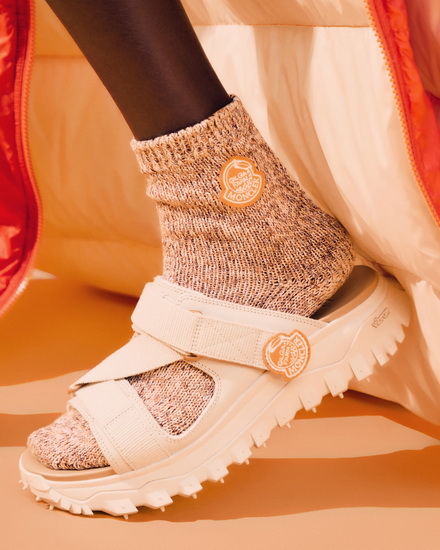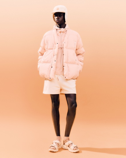 系列的設計細節別具一格,其中一大亮點是加入了Moncler經典的卡通果形象。這款吉祥物的形象以農夫造型亮相,成為系列中的俏皮玩味元素,點綴在多款服飾和配飾上,增添了活潑與趣味。系列中還有一款羽絨外套,可以變成睡袋,將實用性與趣味性相結合,這正是Glover創作中的一大亮點。此外,配飾方面,如園藝帽和耐用的涼鞋等也為整個系列增添了實用性,結合寬鬆剪裁、高科技面料、玩味的圖案及創意細節,讓整體造型更具時尚活力。Moncler的經典涼鞋以簡約實用的皮革和棉質緞帶製成,白色鞋面搭配淺粉紅色鞋底,完美搭配愛好實用風格的探索者。