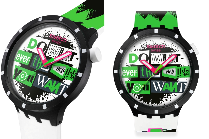 LASH OUT 結合棋盤格圖案、螢光色細節與搶眼的日曆盤,錶盤印有「DO WHATEVER THE… YOU WANT」字句,最後留白讓佩戴者自由定義屬於自己的態度。設計大膽直接,讓人在日常佩戴中也能清楚表達「拒絕被規則束縛」的精神。螢光色與棋盤格在視覺上營造街頭型格,即使簡單穿搭也能讓風格更完整。