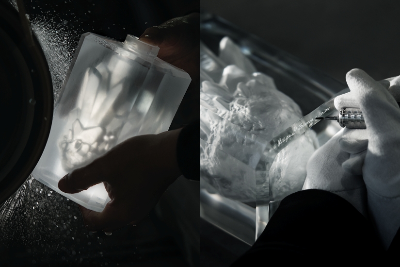整體工藝採用Lalique復興的「脫蠟鑄造法」,此古老技術源於1893年,由法國阿爾薩斯地區Wingen-sur-Moder的Lalique工坊傳承至今,讓瓶身內部複雜細節得以完美實現。香水瓶配搭純白雲石外盒,經工匠細緻雕琢後展現通透質感,外型如一座羅馬雕塑作品,兼具收藏與展示價值。Brioni設計總監Norbert Stumpfl形容此創作為多重珍稀元素的完美交匯,亦體現品牌對「慢奢華」理念的執著。