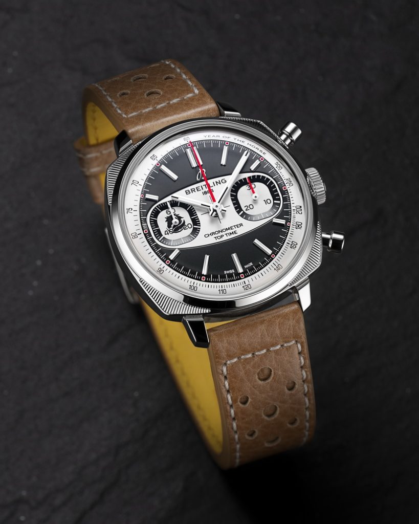 Breitling 向馬年致敬,推出限量 288 枚的 Top Time B01 Shadow Rider 赤影黑騎特別版,將賽馬的爆發力與時計的精準度結合,重現品牌 Top Time 系列於 1960 年代奠定的風格與態度。這款新作並非單純換色或改名,而是從設計結構、材質運用到機芯配置都展現深度。
