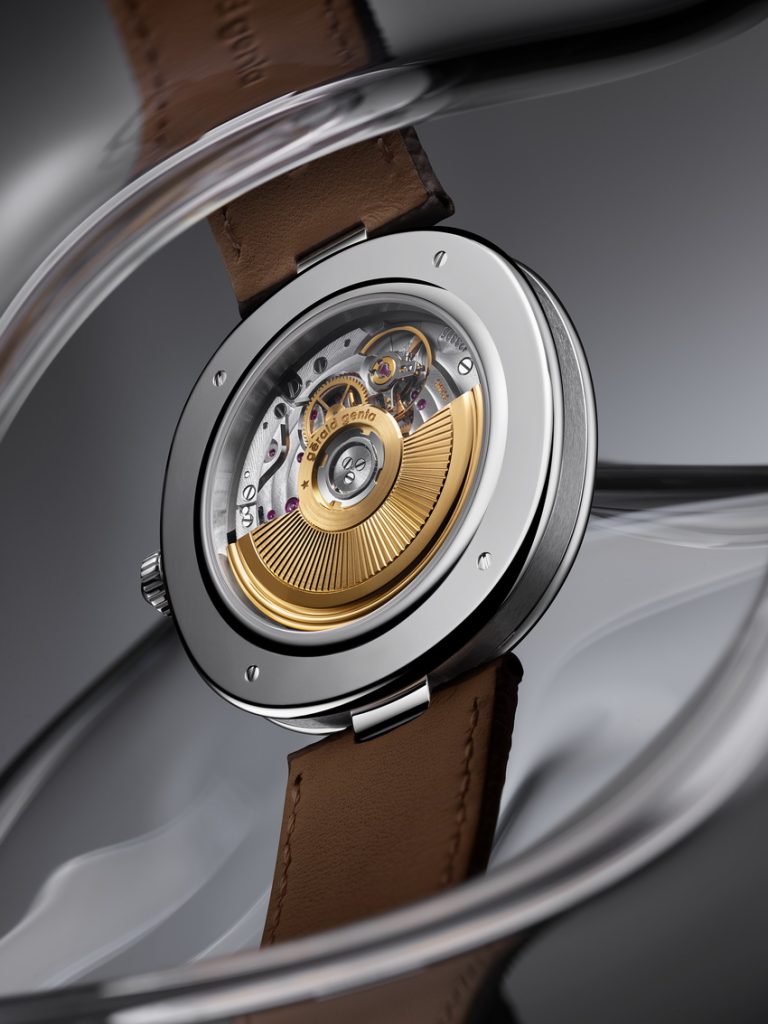 機芯方面,兩款腕錶均搭載Zenith Elite GG-005P自動機芯,配備重新設計的自家自動擺陀,透過透明底蓋一覽無遺。此機芯運作頻率為4Hz,動力儲備達50小時,由158個零件組成,確保穩定表現與每日佩戴的可靠性。顯示功能方面則回歸極致簡約,只保留小時與分鐘,讓錶盤更加純粹俐落。