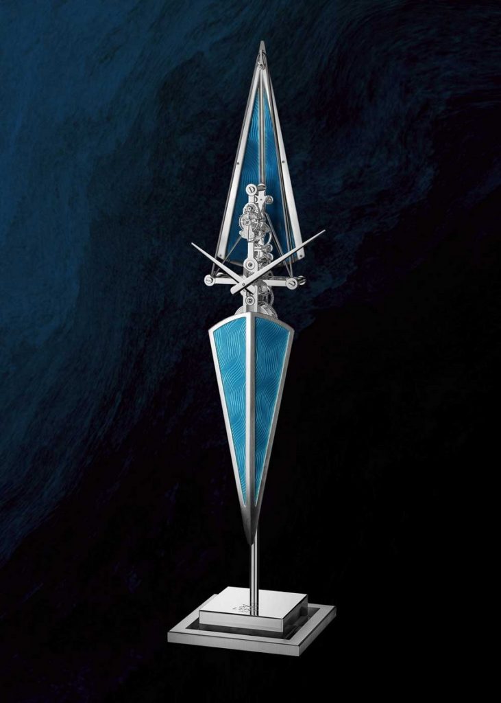第二款作品La Regatta Blue Horizon則以簡約見稱,外觀呈現一片深藍色海面。工藝上應用了flinqué琺瑯技術,先以guilloché機刻雕花製作底紋,再疊加藍色透明琺瑯層,讓底部幾何圖案依然清晰可見。隨光線角度變化,琺瑯呈現細緻光影變化,模擬船身切開水面的視覺動感,展現極高製作精度與藝術平衡。