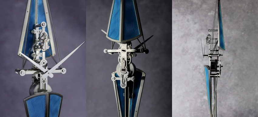 La Regatta系列的設計靈感來自比賽划艇,整體外形高518毫米,以垂直構造呈現流線型艇身,配以120毫米方形底座。所有齒輪與擒縱結構沿垂直軸線排列,機芯以發條盒與擒縱裝置對稱分佈於頂部與底部,呼應划艇動作的穩定節奏。這種建築式設計不僅呼應划手挺直的身姿,更營造出平衡、對稱與秩序的視覺效果。