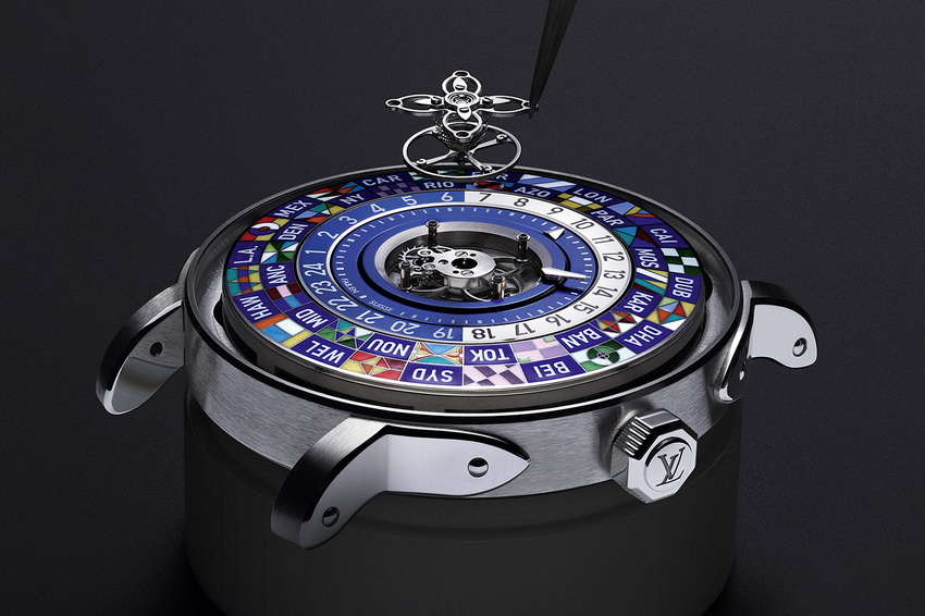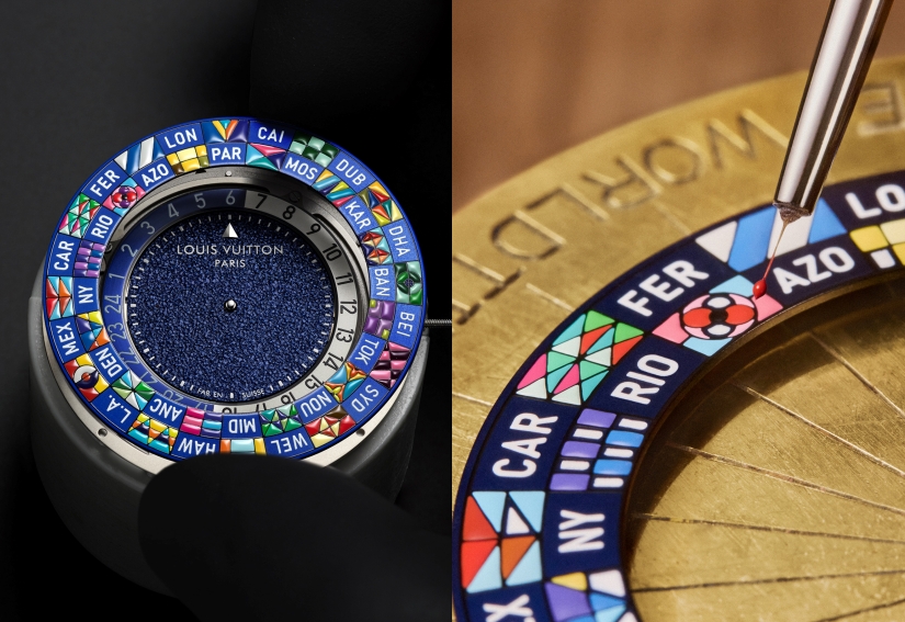 Escale Worldtime 延續三環式時間顯示設計,最外圈標示城市,中圈為跳時盤,中心顯示分鐘。城市環可雙向旋轉,並可透過錶冠兩段調校操作。其手繪24地區旗幟圖樣,出自 La Fabrique des Arts 內的工藝工作坊,每一枚錶盤需耗費超過一星期以35種顏色細緻繪製。這些圖案並非隨意拼貼,而是結合品牌歷史符號設計,例如 Gaston-Louis Vuitton 所創的「V」圖樣,或 Monogram 花紋的轉化版本,體現品牌將旅行與個人身份象徵視為同一體驗的精神。