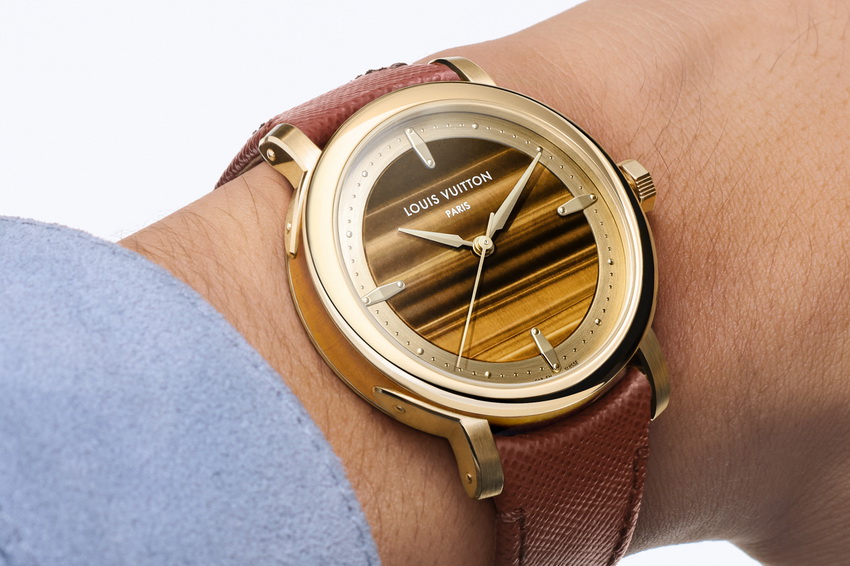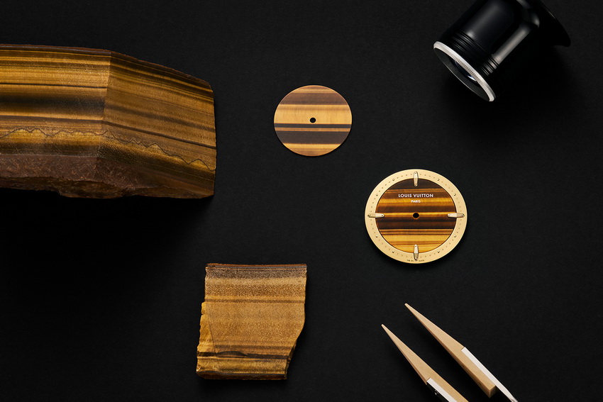 壓軸登場的Escale Tiger’s Eye,為全球限量30枚珍稀之作,首次於Escale系列中採用黃金搭配天然虎眼石材質製作整圈錶殼與錶盤。虎眼石經地質轉化而成,內部纖維交錯形成「貓眼效應」,視覺上有如光波隨手腕轉動而流動。La Fabrique des Boîtiers為此石材量身訂製精細加工程序,石質密度高但局部易裂,需以顯微精度切削,再手工拋光方能呈現天然光澤。