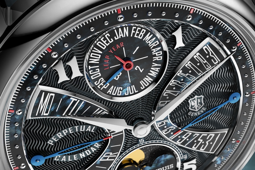 主錶盤飾以波浪狀guilloché圖案,取材自品牌早期設計,亦模擬沙丘因風形成的自然紋理。錶面以「Astral Blue」深藍漆面處理,視覺層次隨光線變化而轉動。時間指示由18K白金製成的時、分指針呈現,而雙逆跳功能使用漆面黃銅指針,有助減輕慣性,提升回跳穩定度。面盤上配有四個阿拉伯數字時標,呼應設計所向的中東文化背景。
