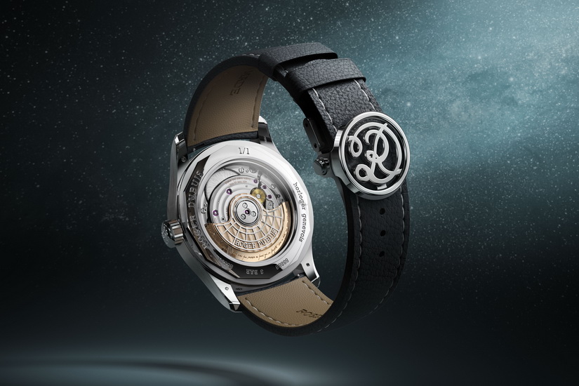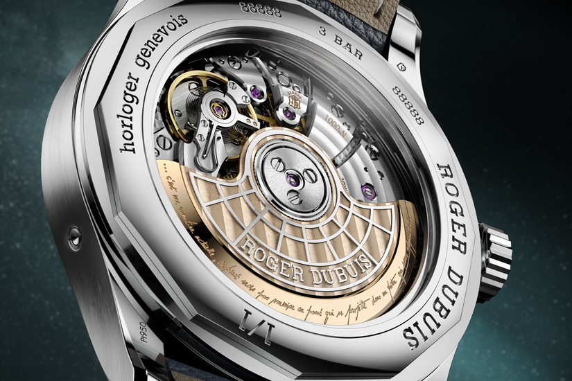 腕錶採用38毫米鉑金錶殼,厚度11毫米,搭配全鉑金錶圈、底蓋與錶冠。配套的星辰藍小牛皮錶帶縫入鉑金絲線,連錶扣亦為鉑金打造,並刻上品牌首代標誌。錶盤方面,由五層結構組成,是Roger Dubuis早期創作風格的延伸。邊緣使用經高光潤飾的珍珠母貝製作,嵌入拋光金屬圓點刻度,日曆顯示區同樣採用珍珠母貝,配上手工倒角框線。
