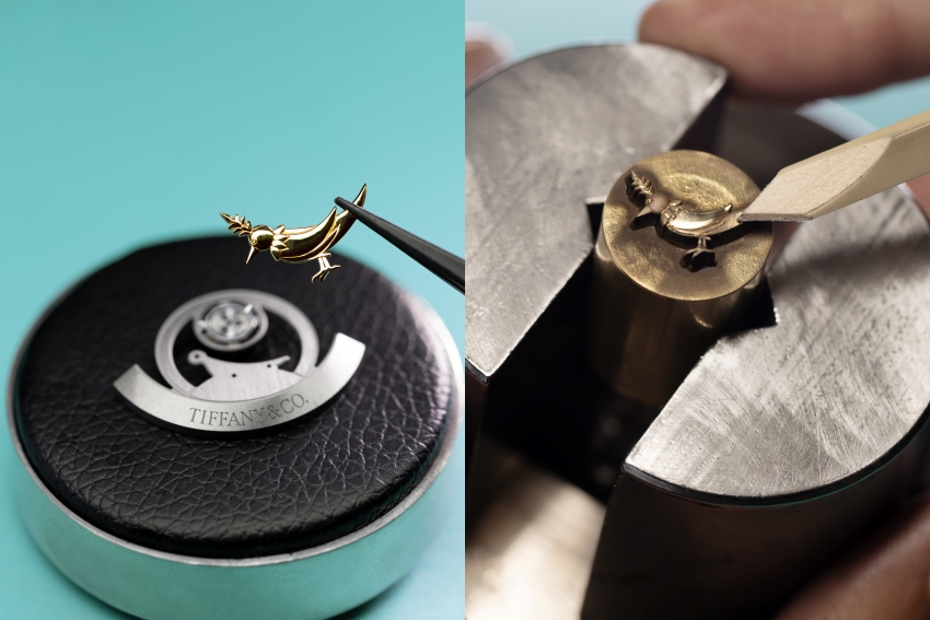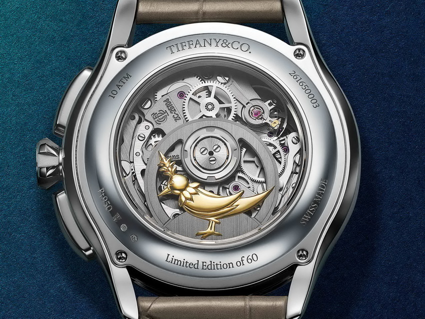 錶背部分,則見證品牌個性化設計的展現。透過藍寶石水晶底蓋,可見機芯轉陀上鑲嵌的18K黃金Bird on a Rock雕飾,此設計源自Jean Schlumberger經典作品,由工匠全手工雕刻與打磨完成。為確保轉陀運作平衡,Zenith需對整體重量重新校準。這項設計既富詩意,亦成為Tiffany Timer系列的標誌性細節。正如Tiffany Watches副總裁Nicolas Beau所言:「我們不是要展示,而是讓懂的人在使用過程中慢慢發現。」