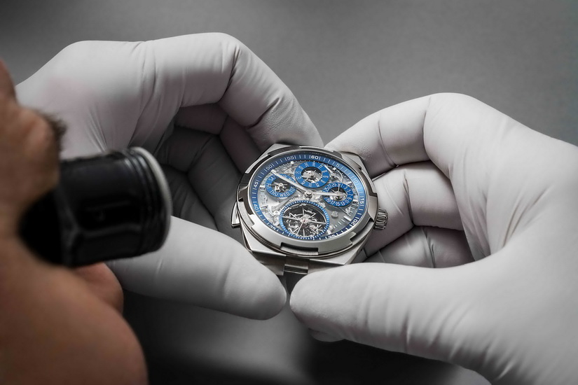 藍寶石水晶鏤雕錶盤下,灰色NAC電鍍板橋與銀色鍍銠輪系交錯構成先鋒視覺,18K白金指針與時標覆上藍色Super-Luminova®夜光塗層,增強讀時清晰度。報時調速器設計獨特,透過向心性裝置靜音控制敲擊節奏,固定弧形杆更以18K金製成並雕有品牌創辦人Jean-Marc Vacheron的姓名首字母,增添收藏意義。陀飛輪運行頻率為2.5赫茲,板橋經倒角與緞面拉絲工藝處理,展現極致手工美學。整枚腕錶隨附五級鈦金屬摺疊式錶扣,並配備可替換的鱷魚皮與橡膠藍色錶帶,無需工具即可轉換佩戴風格。