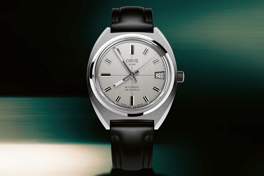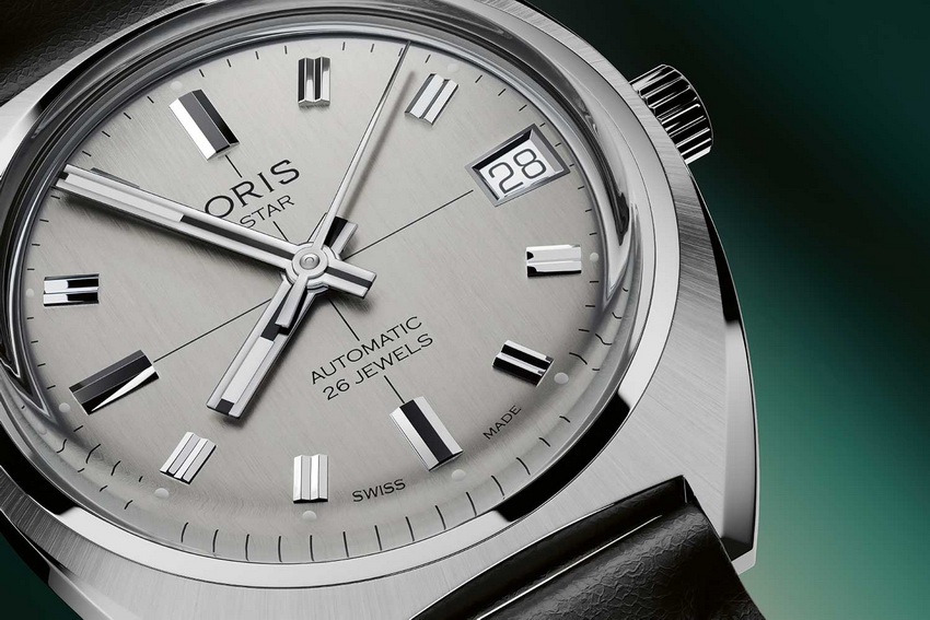 2026 年的 Oris Star Edition,延續這些元素。35.00mm 不鏽鋼錶殼保留復古比例,枕形輪廓帶有鮮明年代感;銀色面盤配立體時標與粗身指針,並採用帶有分區感的佈局設計,3 點鐘位置設有略帶不對稱的日期窗,整體細節均忠於原作。