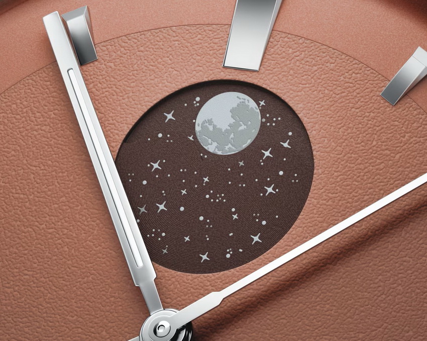 面盤細節亦經過重新處理。傳統月相多以半圓形開口呈現,容易與整體設計產生割裂感;今次透過與面盤同色調的星空背景,讓月相自然融入其中,並與下方小錶盤形成呼應,使版面更一致。