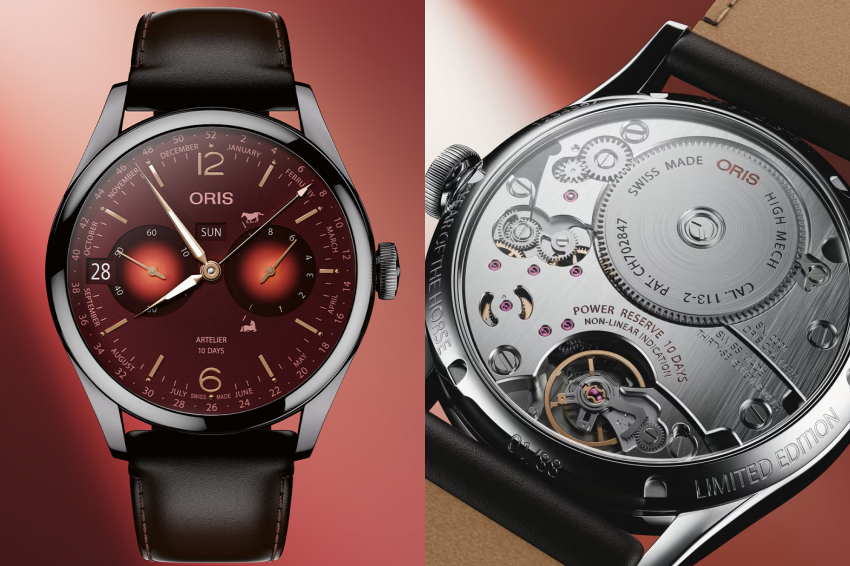 Oris 推出 Big Crown Calibre 113 馬年主題腕錶,錶盤以暗紅色分層設計呈現火焰意象。中央指針式日期顯示配合星期、月份與週次視窗,構成完整日曆功能。