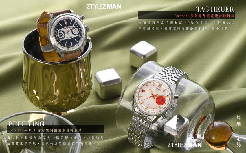 4. Breitling Top Time B01 赤影黑騎限量版計時腕錶 & 5. TAG Heuer Carrera 馬年限定版計時腕錶