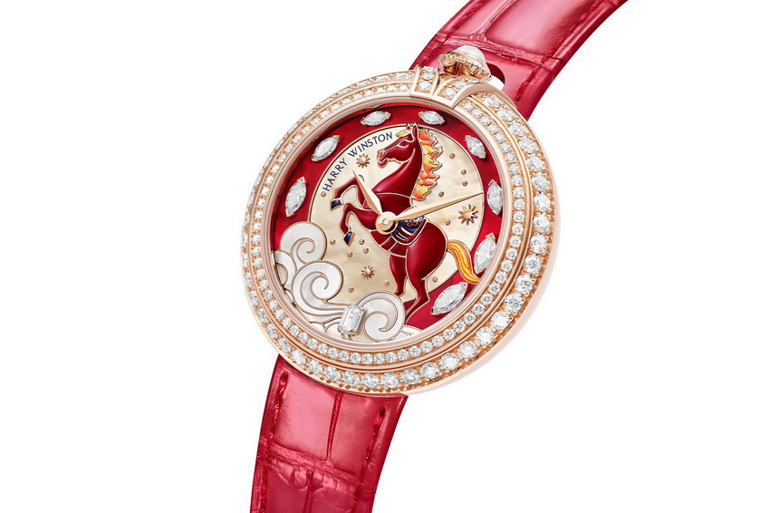 Harry Winston 推出全球限量 8 枚 Chinese New Year Automatic 腕錶。外圈以紅色珍珠母貝雕刻成馬蹄造型,鑲嵌馬眼形切工鑽石,由上而下尺寸遞增。6 點位鑲嵌祖母綠形切工鑽石,成為品牌標誌元素。