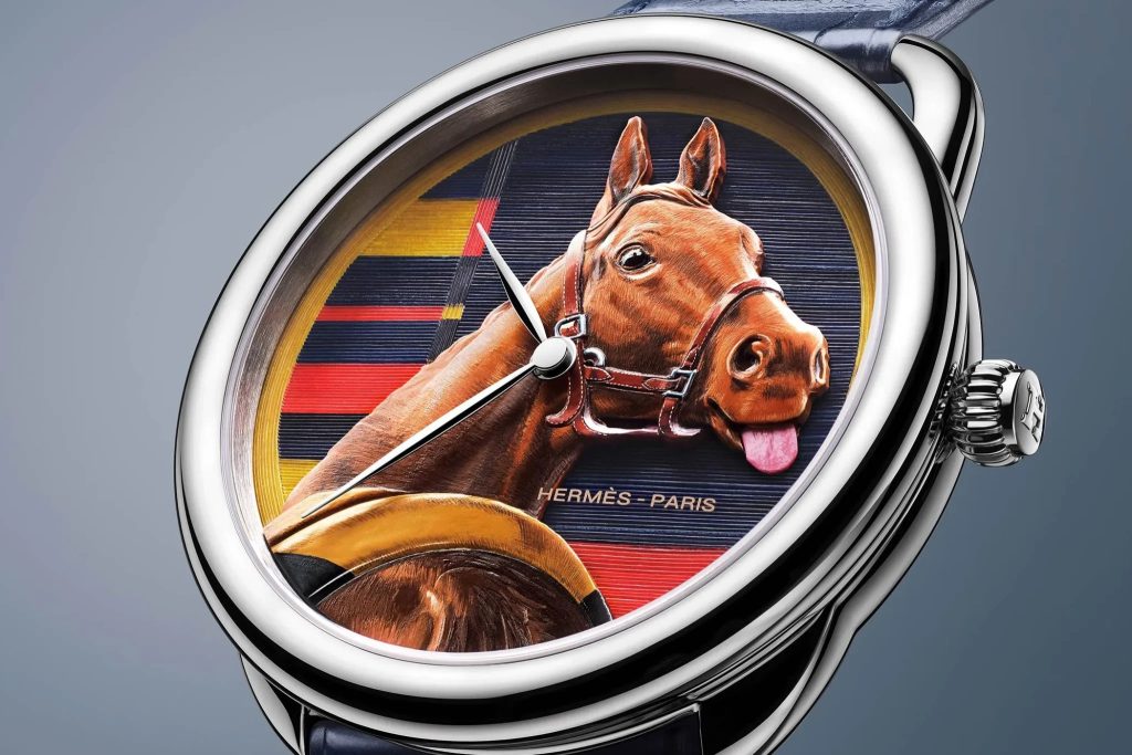 Hermès 以 Arceau 錶殼為基礎,錶盤結合手工雕刻、微繪與馬鬃毛鑲嵌工藝,重現絲巾圖案中的馬匹形象。色彩與紋理層層堆疊,構成立體畫面。