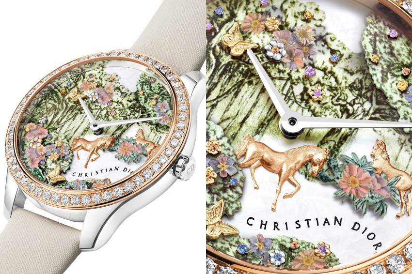Dior Grand Soir 馬年特別版全球限量 30 枚。36mm 錶殼搭配鑲嵌 52 顆鑽石的玫瑰金錶圈。錶盤以珍珠母貝為底,鑲嵌紫水晶、錳鋁榴石與彩色剛玉,中央立體駿馬細節鮮明。
