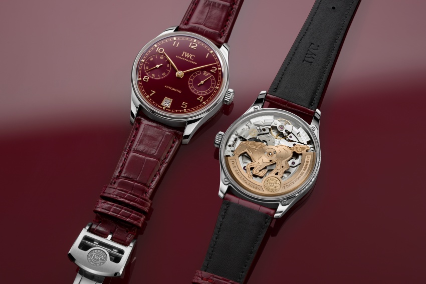 IWC 為馬年推出 Portugieser Automatic 42 特別版。42mm 精鋼錶殼搭配弧形藍寶石鏡面與透明底蓋,比例修長。酒紅色錶盤以放射紋處理,配搭阿拉伯數字時標與葉形指針,小秒盤與動力儲備顯示維持系列標誌性對稱布局。