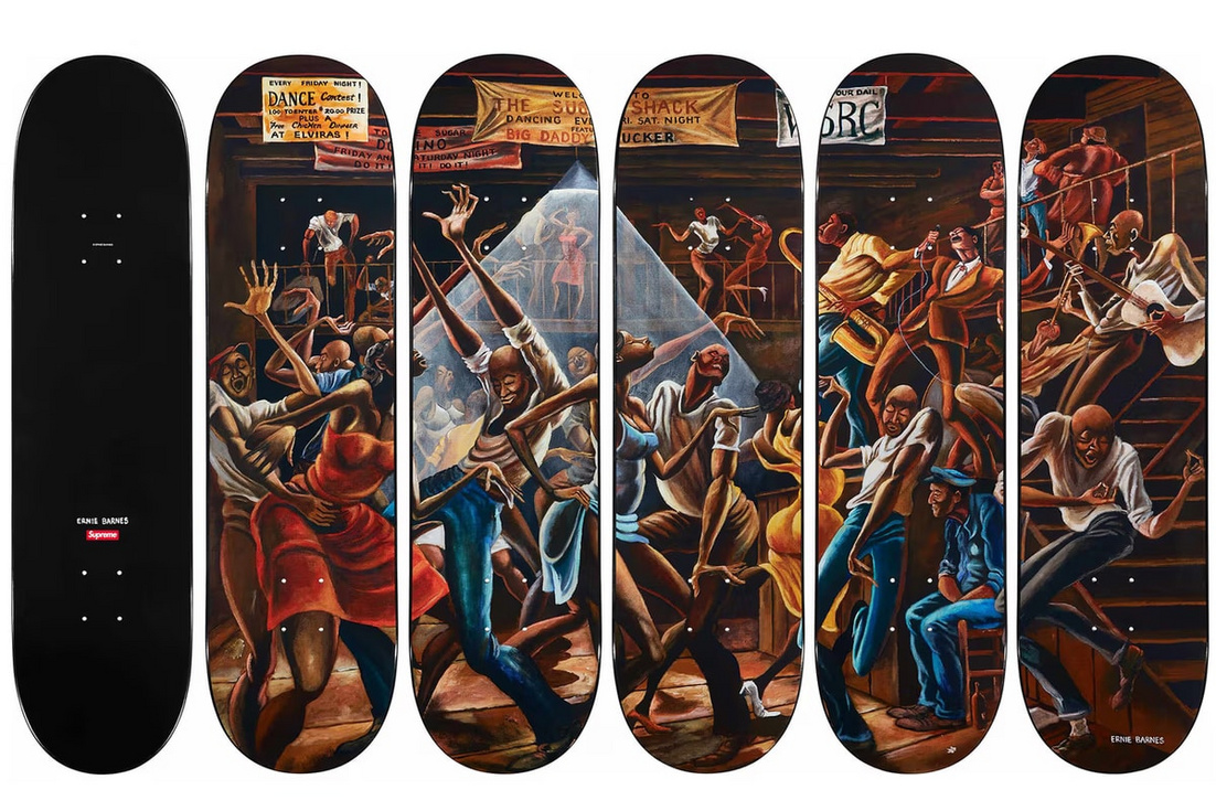 Ernie Barnes作为美国首位成功从运动员转型为艺术家的代表,其独特的'Elongation Technique'使人物形象延展出动感和活力。他的作品常描绘非裔美国人社区的生活场景,本季Supreme选择了《The Sugar Shack》和《Main Street Pool Hall》这两幅画作,展现了生动的街头文化与社区韵味,兼具历史感与现实社会反思。